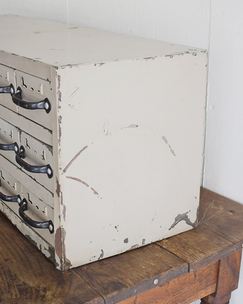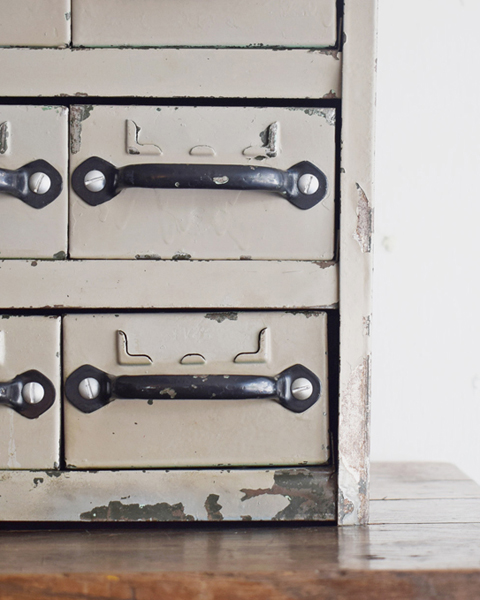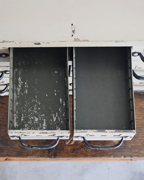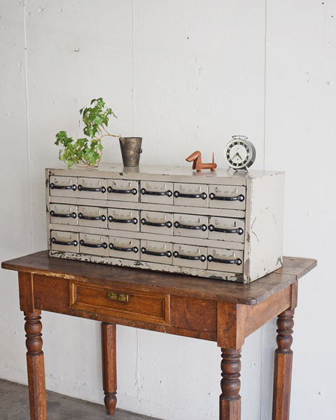 ヴィンテージならではの渋さのある質感が魅力的。無骨な表情との対比で、木の家具や布ものなど有機的なデザインや素材と合わせても良さそうです。ワークスペースの収納や、リビングや店舗で、ディスプレイを兼ねた使い方にも取り入れやすいと思います。