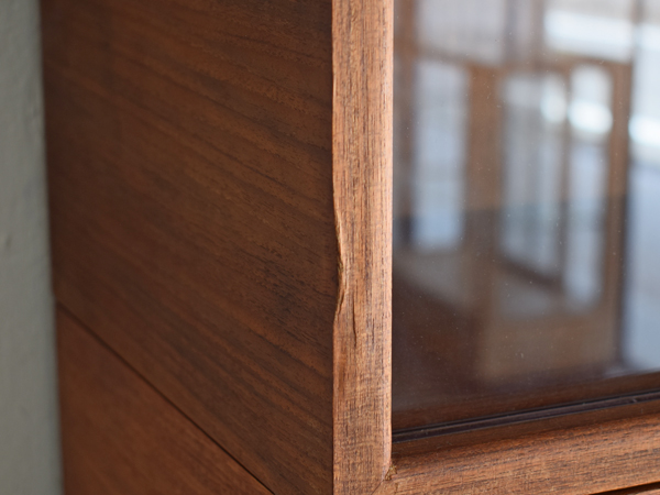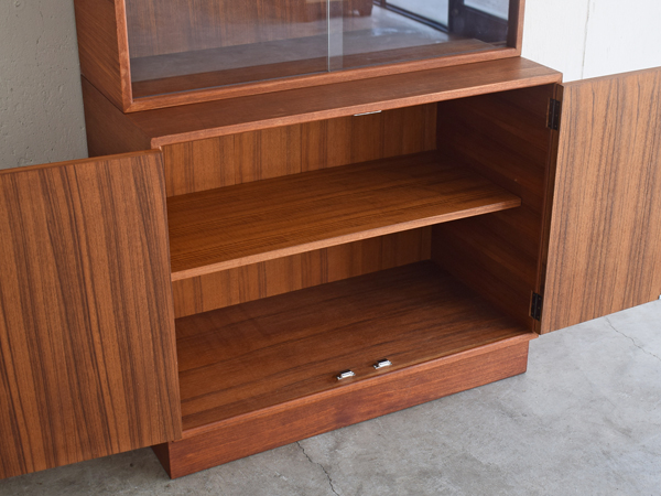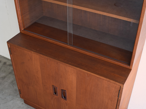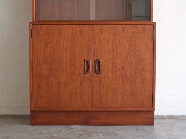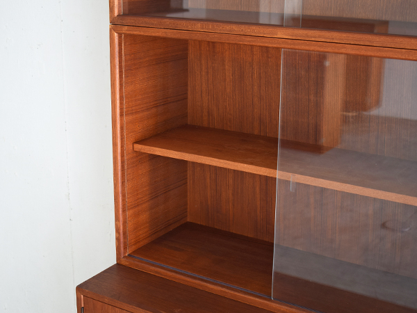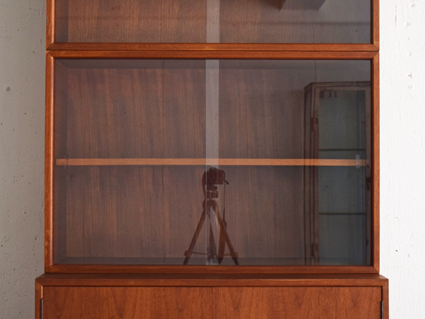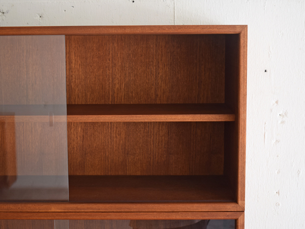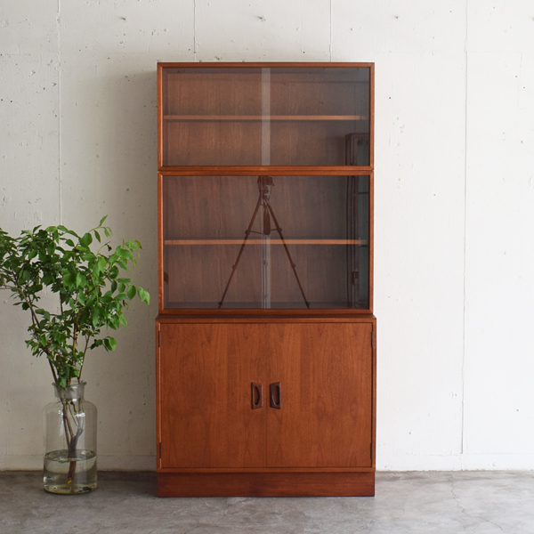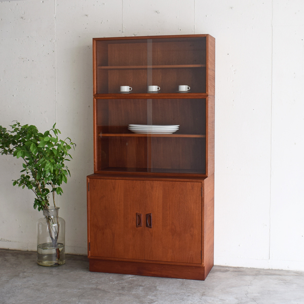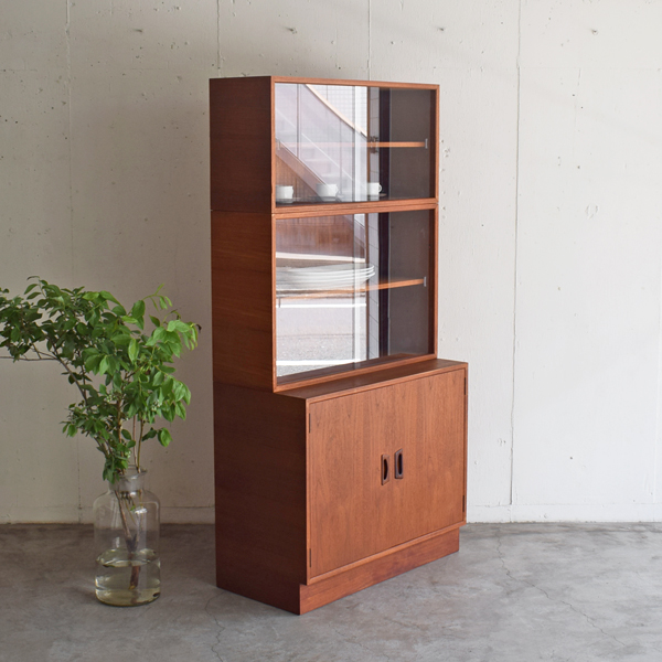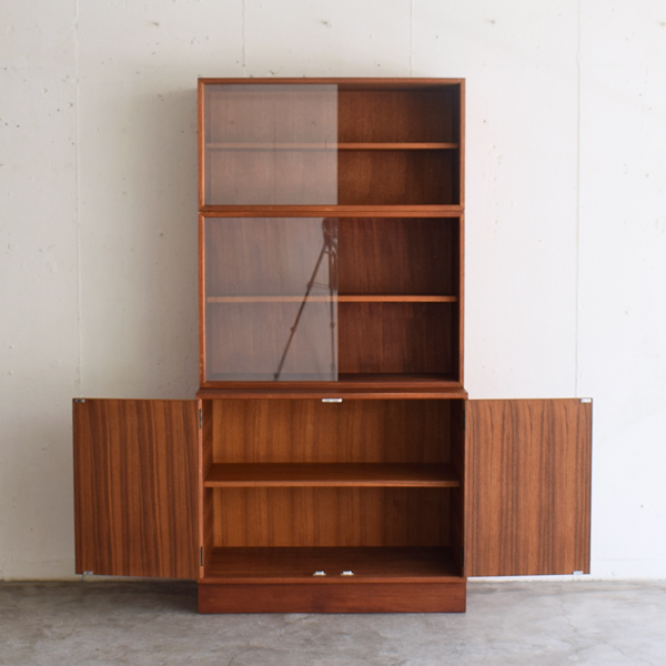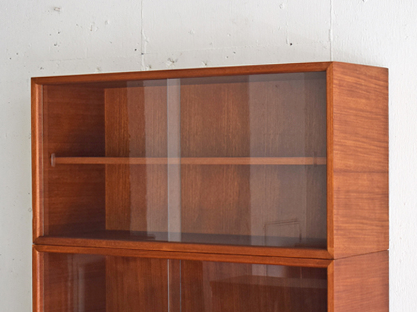 これまでも度々入荷しているシリーズで、今回入荷したものはガラスの引き戸棚が2点と奥行きの深い開き戸棚の、計3点による組み合わせとなっています。