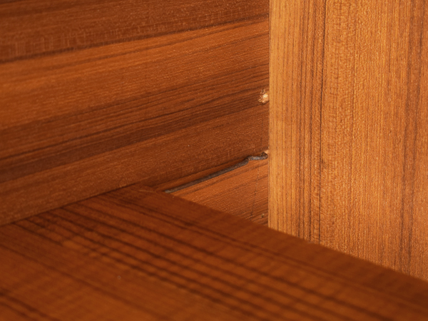 開き戸はチーク材板目の突き板がブックマッチの技法で仕上げられており、おおらかな木目が視覚的なポイントになっています。