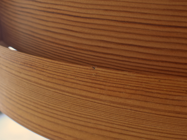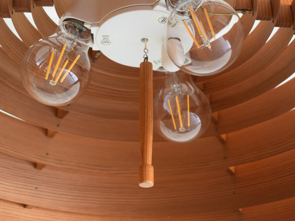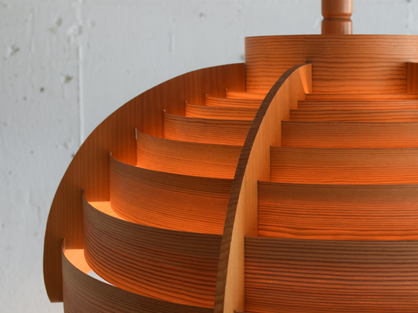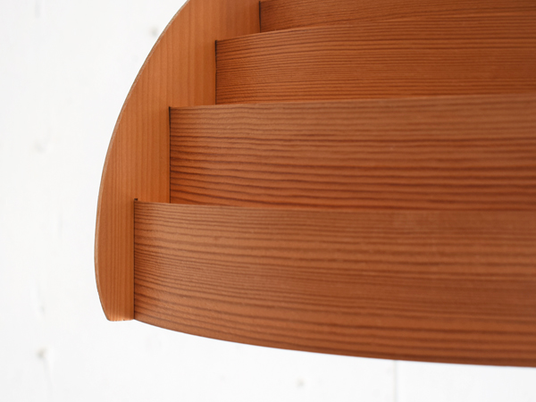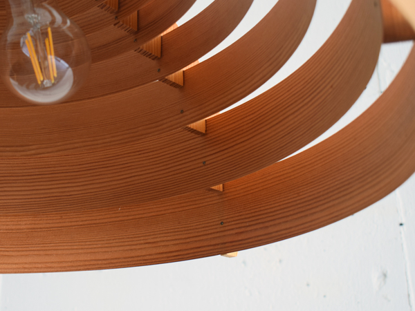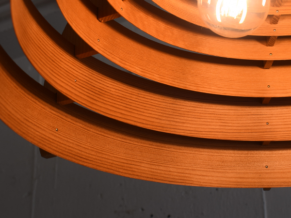 長い時間をかけてゆっくり乾燥させて薄くスライスし、サイズ違いの円形に整形したパイン材が連なるシェードの構成が特徴的なシリーズで、こちらは3灯の、比較的大きなサイズ感のモデルとなります。