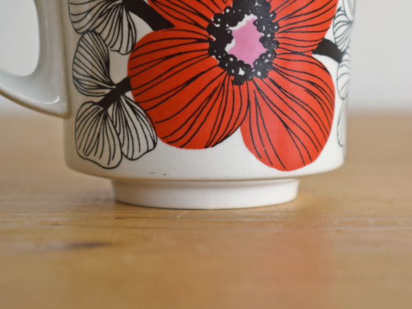 フォルムデザインはGöran Bäck (ゴラン・バック) 、装飾デザインはRaija Uosikkinen (ライヤ・ウオシッキネン) が手がけており、“Isokukka” (大きな花) のシリーズ名の通り、大きなケシの花がシルクスクリーンでプリントされています。
