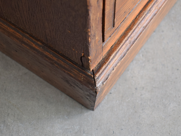 下がり付きの真鍮製取っ手は、全て当時のオリジナルが残っています。引き出しの前板は面取り加工され、床と接する袴は下に向かって窄まっており、作り手の美意識が細部まで宿っている印象です。鍵は欠品していますので、ご了承ください。