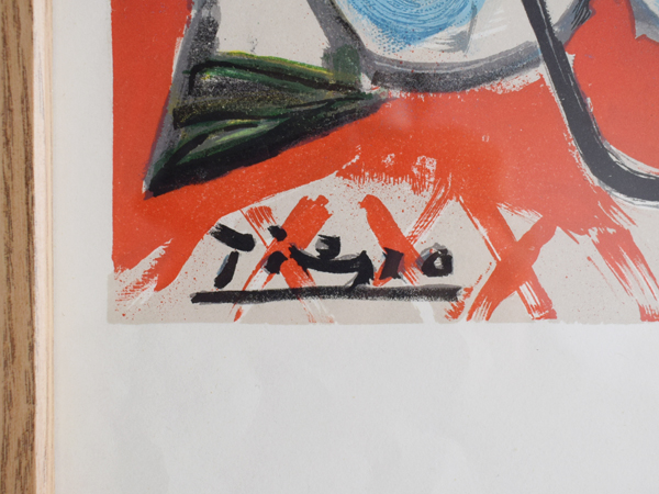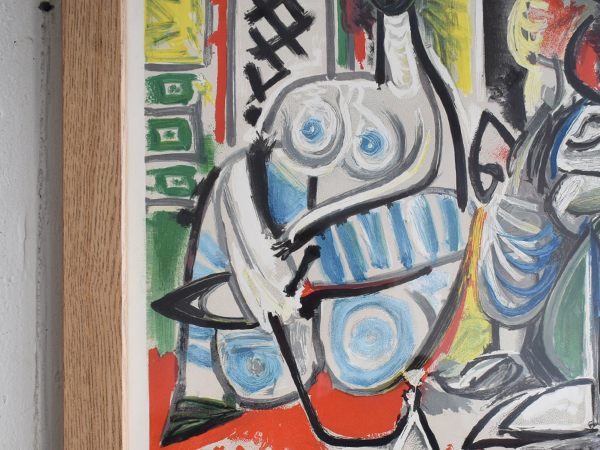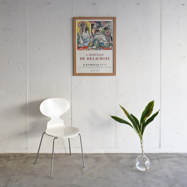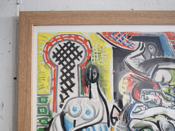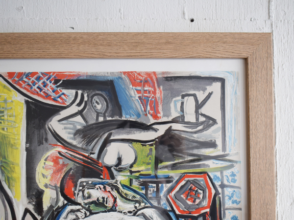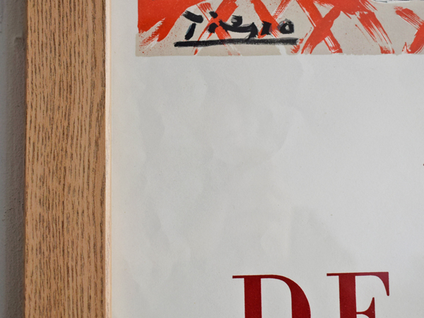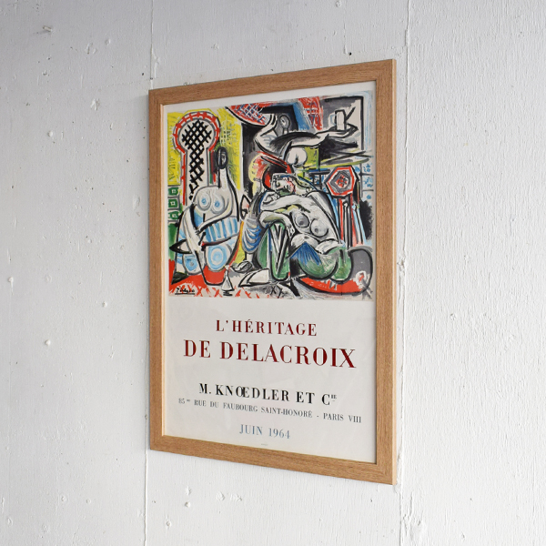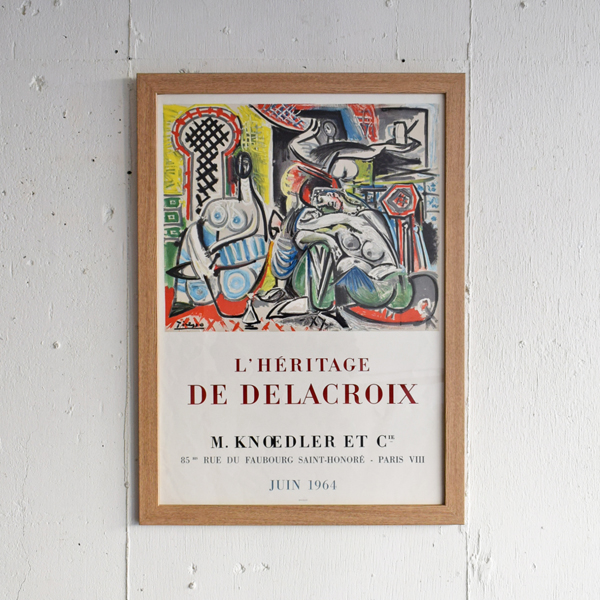 1964年に製作された、Pablo Picasso (パブロ・ピカソ) による作品をメインビジュアルに使用したリトグラフポスターです。“L'HÉRITAGE DE DELACROIX”とのタイトル表記が見られ、フランスのロマン主義を代表する画家、Eugène Delacroix (ウジェーヌ・ドラクロワ) へのオマージュ作品の展示だったものと思われます。当時のオリジナル。額装済み。