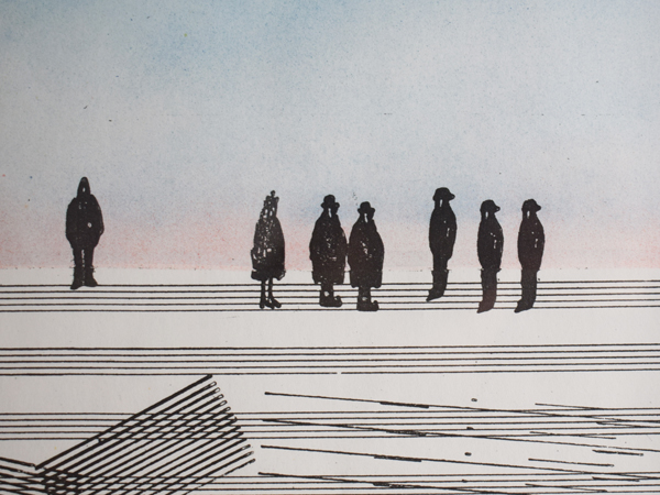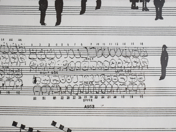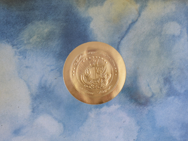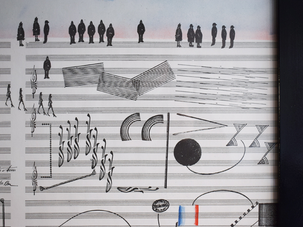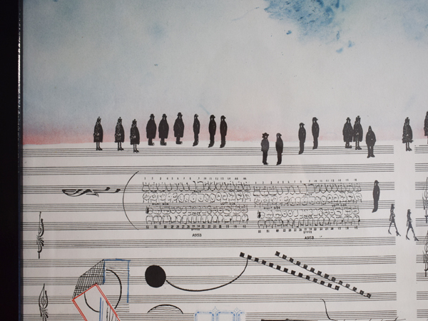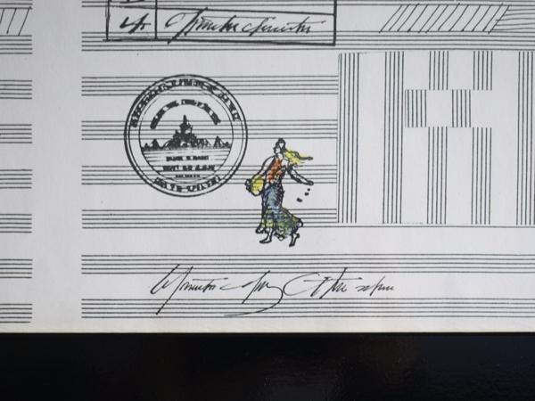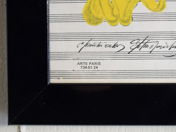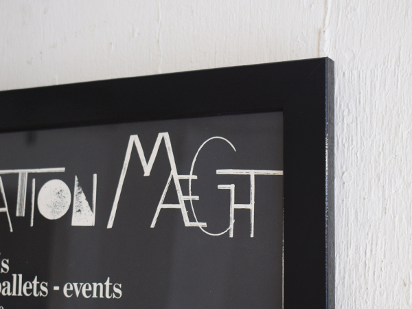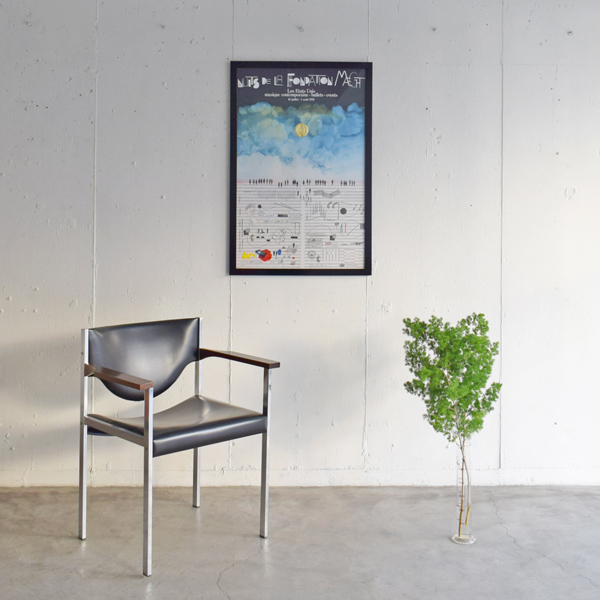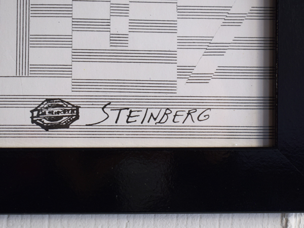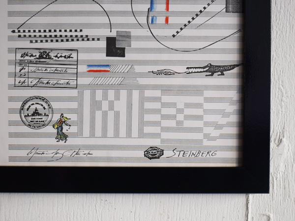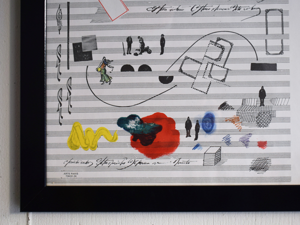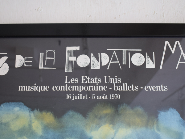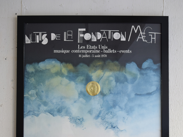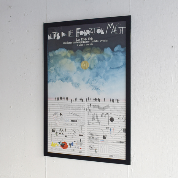 こちらは現在店頭に出しておりませんので、現物確認をご希望の際は事前にご連絡ください。1970年に、南フランスSaint-Paul-de-Vence (サン=ポール=ド=ヴァンス) にある、Maght美術館で開催されたイベントのために制作されたものとなります。当時のオリジナル。タイトルは“Nuits de La Fondation Maeght” (マーグ財団の夜) 。アメリカの現代バレエと音楽を紹介するイベントだったようで、7月16日から8月5日にかけて開催されました。夜空のような水彩のグラデーションに金色のエンボス加工されたメダリオンが貼り付けられ、輝く満月のよう。下の五線譜には、様々なモチーフが散りばめられています。スタンプで押されたような人物や、絵の具のシミや落書きのようなライン、五線譜を再構築したモチーフやワニの姿も見られ、スタインバーグの遊び心が感じられ、前衛芸術のようでもあります。歯列のような図柄、端に薄い色やけがありますが、それほど気になるものでは無いと思います。ポスターというより、手書きのフォントなども含め、アート作品といっても差し支えないでしょう。どんな人たちが集まっていたのでしょうか、南仏の夜に思いを馳せてみたくなる1枚です。